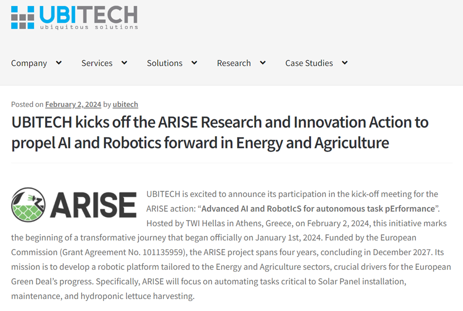 We are excited to share that UBITECH, one of our esteemed partners, has published a press release on the ARISE project.